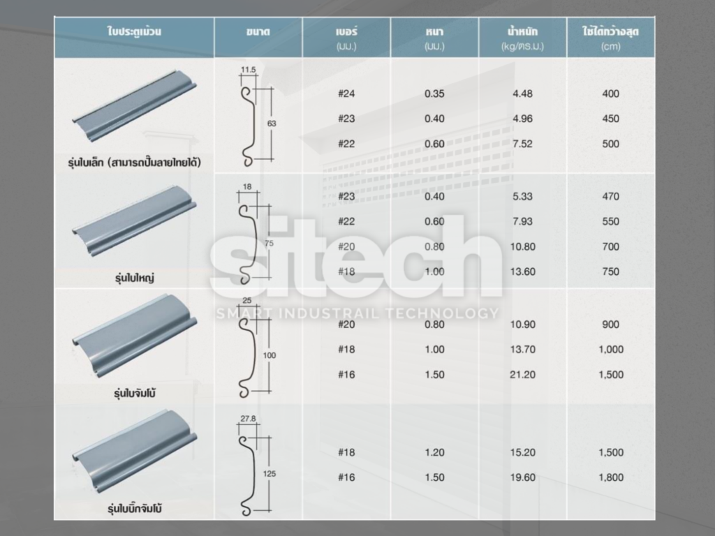 เป็นวัสดุมาตรฐานที่นิยมใช้กันแพร่หลายที่สุด มีทั้งแบบเหล็กเคลือบสีและเหล็กซิงค์กันสนิม ข้อดี : ความแข็งแรงสูง: ทนทานต่อการงัดแงะและการกระแทกได้ดีเยี่ยม ราคาย่อมเยา : เป็นตัวเลือกที่คุ้มค่าที่สุดเมื่อเทียบกับวัสดุอื่น ซ่อมแซมง่าย : อะไหล่หาง่าย ช่างทั่วไปมีความชำนาญในการดูแล เหมาะสำหรับการใช้งาน : ตึกแถว ร้านค้าทั่วไป และอาคารพาณิชย์ โกดังเก็บสินค้า โรงงานอุตสาหกรรมที่ต้องการเน้นความปลอดภัยและประหยัดงบประมาณ ข้อควรระวัง: ไม่เหมาะกับพื้นที่ใกล้ทะเลเพราะอาจเกิดสนิมได้ง่ายกว่าวัสดุอื่น